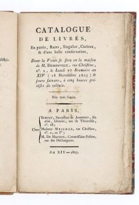 Catalogue. Catalogue des livres, en partie, rares, singulier, curieux & d'une belle conservation, dont la vente se fera en la maison de M. DEMONVILLE […] Paris, Bleuet, Mesenge, de Mauroy, An XIV - 1805.