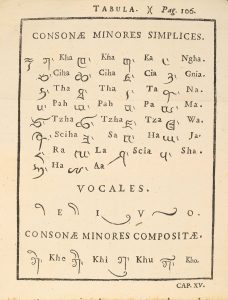 Une planche dépliante typographiée présente la liste des consommes et voyelles du tibétain.