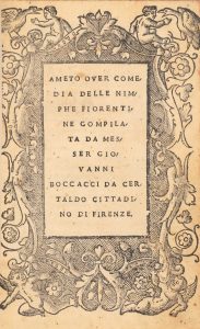 L'un des premières éditions séparées de cette comédie allégorique et pastorale de Boccace, basée sur le texte publié chez Giunta en 1521.