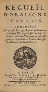 Première édition collective des 6 grandes oraisons funèbres de Bossuet : celles de la Reine d'Angleterre Henriette-Marie de France, de sa fille Henriette-Anne d'Angleterre, duchesse d'Orléans, de la Reine de France Marie-Thérèse d'Autriche, d'Anne de Gonzague de Clèves, Princesse Palatine, du Chancelier Michel Le Tellier, et de Louis de Bourbon, Prince de Condé.