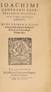 [Livre du XVIe siècle]. CAMERARIUS (Joachim). — Epistolarum libri quinque posteriores. — Nunc primum a filiis in hoc secundo volumine studiose collectae, et editae. — Francofurti, ex Officina Paltheniana, impensis Petri Fischeri, 1595. In-8,...
