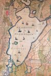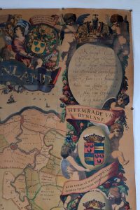 ♦ Rare et importante carte murale de la région du Rijnland, amplement décorée d'un encadrement dû à Romeyn De Hooghe, qui offre en médaillons les noms et armoiries des différents fiefs réunis en 1647.