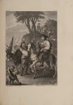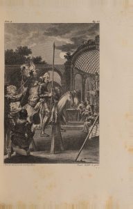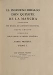 Édition donnée par l'Académie Royale Espagnole, illustrée de 2 frontispices par Carnicero et Arnal, répétés (soit 4 au total), un portrait de Cervantes par Joseph Del Castillo, 14 lettrines ornées, 22 vignettes en-tête et bandeaux et 20 culs-de-lampe par Ballester, Brieva, Carnicero, La Cuesta et Zimeno et 31 figures hors texte par Barranco, Brunette, Del Castillo, Ferro et Gil et une carte dépliante aux limites coloriées.