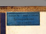 Étiquette du relieur imprimée sur papier bleu «Pasqual Carsi y vidal lo enquaderno. Madrid» ; la signature dorée répétée en queue de chaque dos porte «Pasqual Carsi lo encuaderno».