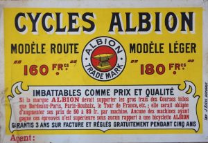 Cyclisme / Albion / Bordeaux. Affiche originale non entoilée. "Cycles Albion, modèle route, 160f, modèle léger, 180"...Albion se singularise par son refus d'entrer dans le monde dans la compétition et de participer aux grandes courses comme Bordeaux-Paris, Paris-Roubaix ou le Tour de France, sinon, ses machines couteraient 50 à 80f de plus...Aucune des machines ayant participé à ces épreuves n'est supérieure à l'Albion, garantie 3 ans, avec un crédit gratuit de 5 ans. Vers 1910. Lithographie. 80X120. Traces de pliure et salissures. Déchirure en partie centrale. Curiosité.
