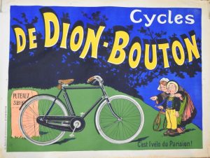 Cyclisme / De Dion-Bouton / Ogé / Puteaux. Affiche originale non entoilée. "Cycle De Dion-Bouton....C'est l'vélo du Parisien..." dit à son fils, la maman bretonne, autant dire, ce qui se fait de mieux. Et Puteaux est à 521 km...Par Eugène Ogé (1861-1936) de l'Académie Julian. Vers 1910. Lithographie. 120X160. La qualité des couleurs préservées, nous émerveille autant que l'affiche. Tache d'humidité en marge. Etat B.
