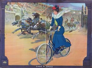 Cyclisme / Ease and Speed. Affiche originale en quatre panneaux, non-entoilée. Dans le cirque romain, l'élégante bleue avec sa machine dame facilement le pion aux quadriges...Cette scène à l'antique fait forcément penser au travail de Henry Gray pour les cycles Gladiator, elle est pourtant signée par le grand artiste anglais Arthur Spooner (1873-1962). Vers 1910. Lithographie. 150X200. Et une frêle cycliste dompta les monstres, "vite fait, bien fait..". Petites déchirures périphériques. Etat B.