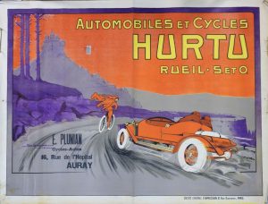 Automobile / HURTU / Rueil. Affiche originale non entoilée. "Automobiles et cycles HURTU , Rueil..." Le bolide de feu fait la course avec un lutin cycliste...Par Géo Dorival (1879-1968). Vers 1910. Lithographie. 160X120. Couleurs préservées et éclatantes. Image rarement vue. Petites déchirures périphériques. Etat B