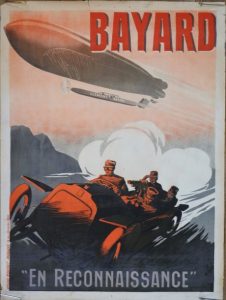 Automobile / Aérostation / Militaria. Affiche originale non-entoilée. "Clément-Bayard, en reconnaissance..." Dans les années 1910, la tension entre la France et l'Allemagne est palpable, et l'auto, comme le ballon Clément-Bayard sont forcément très utiles...D'après Ernest Montaut de Montauban (1878-1909). Vers 1910. Lithographie. 160X120. Petites déchirures périphériques. Etat B.