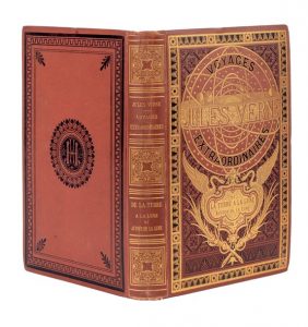 [Espaces célestes] De la Terre à la Lune / Autour de la Lune par Jules Verne. Illustrations par de Montaut (De la Terre à la Lune) et Émile Bayard et A. de Neuville (Autour de la Lune). Paris, Bibliothèque d'Éducation et de Récréation, J. Hetzel et Cie, sd (ca 1885).