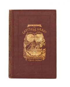 Grand in-8° triple. Cartonnage personnalisé de l'éditeur en pleine percaline chocolat à gros grains portant les mentions «Les Enfants / du capitaine Grant / Voyage autour du Monde / par / Jules Verne / Les Voyages Extraordinaires / Edition J. Hetzel» en couverture. Charles Magnier Relieur. Tranches dorées. Gardes veloutées beige-mauve. Imprimerie Jules Bonaventure.