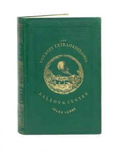 Grand in-8° double. Cartonnage éditeur personnalisé en pleine percaline vert gazon portant les mentions «Les Voyages Extraordinaires / Ballon & Centre / Jules Verne» au premier plat. Cartonnage sans marque de relieur ni d'éditeur. Tranches dorées. Gardes veloutées gris souris. Imprimerie Jules Bonaventure.