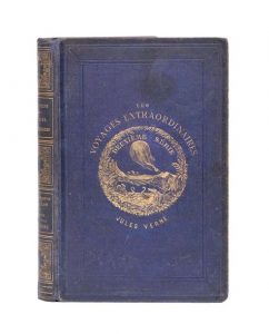 Grand in-8° double. Cartonnage éditeur personnalisé en pleine percaline bleu nuit portant les mentions «Les Voyages Extraordinaires / Deuxième série / Jules Verne» en couverture. Charles Magnier relieur. Tranches dorées. Gardes peigne. Imprimerie Jules Bonaventure.