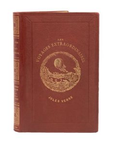 Grand in-8° double. Cartonnage éditeur personnalisé en pleine percaline havane à gros grain portant les mentions «Les Voyages Extraordinaires / Jules Verne» au premier plat. Sans marque de relieur. Tranches dorées. Gardes veloutées grises. Imprimerie Gauthier-Villars pour les deux titres.