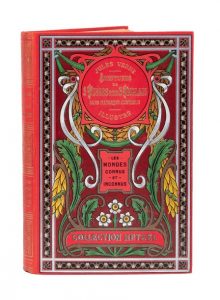 Grand in-8° simple. Cartonnage éditeur en pleine percaline polychrome de l'éditeur «aux feuilles d'acanthe et à la pastille rouge». Ch. Magnier et Fils relieurs. Tranches dorées. Gardes bleu-gris. Trois planches hors-texte en couleurs. Imprimerie Belin.