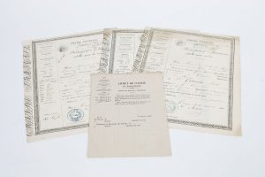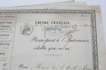- Le troisième et dernier est attribué à Mr Suzanne Salomon, forain de profession, fait à Troyes le 19 mars 1856, signé par le maire, caché humide vert de la mairie de Troyes. État correct pour ces trois documents, vendu en l’état.