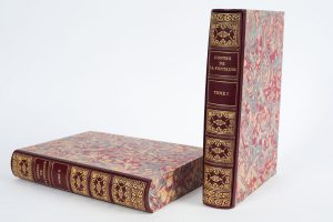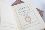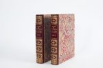 La FONTAINE (Jean de) — Contes. — Paris Union Littéraire et S.D. (circa 1950). — 2 volumes in-4°, en simili maroquin grenat dont les plats sont décorés d'un important encadrement de dentelles dorées, dos sans nerf ornés, doublures et...