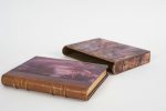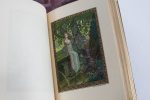 Contreplats de maroquin tabac avec encadrement de guirlandes dorées. Une garde en début et in-fine habillée de soie avec décor figuratif reprenant une aquarelle de Carlos Schwab.