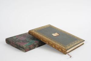 Contreplat et garde de soie rose avec encadrement de guirlandes dorées.