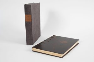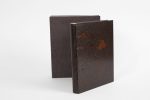 Reliure à mors ouverts en box brun estampé, plaques de métal rouillées et vernies, déclinaison de gardes de différents papiers assortis au métal'et à sa rouille, contre-gardes en daim brun glacé, couture au fil'brun caramel'sur lanières de crocodile brunes.