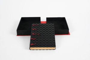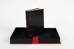 Boîte en papier Lamali rouge et noire (intérieur en daim noir). "Chaque reliure d’Annie Robine, même la plus janséniste, fait penser à une fête, jubilation baroque de l’éclat, grand moment de déploiementa.