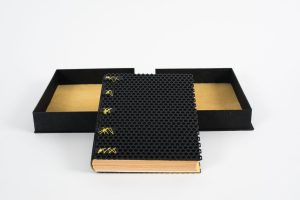 Boîte en papier Lamali (intérieur daim jaune). "Annie Robine, la reliure en liberté. De la sobriété au baroque, son amour de l’écriture, du texte et de la lecture, associé à sa formation artistique la conduise à utiliser les plats du livre comme supports de son expression artistique. Elle n’a de cesse de sortir du carcan de l’académisme, préférant faire exploser les codes de la reliure classique ; elle explore des directions insoupçonnées, veillant à ce que chaque livre soit pour elle une remise en question."