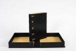 Reliure à mors ouverts sur vache noire estampée, grilles de métal peintes en noir, couture au fil'jaune sur lanières épaisses de crocodile noires.