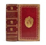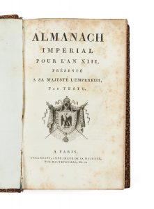 impériales dorés, dentelle intérieure dorée, tranches dorées (reliure de l’époque). [8] ff., 824 p. Première année sous cette appellation de cette publication célèbre, la plus importante en termes d’almanach administratif : « la quantité et la diversité des renseignements fournis par cet annuaire, la précision apportée dans sa rédaction, le nombre incalculable de documents relatifs aux anciennes institutions en font un répertoire de premier ordre qu’aucun autre recueil ne peut remplacer » (Saffroy). Exemplaire relié aux armes impériales. Bibliographie : Saffroy, Almanachs, n° 180. OHR, pl. 2652, à rapprocher du fer n° 7. Coins émoussés et restaurés, mors et coiffes frottées. Rousseurs, parfois un peu prononcées.
