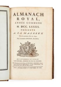 [ALMANACH] Almanach royal année commune MDCCLXXX. Paris, veuve d’Houry et Debure, 1790. Gr. in-8 (21,6 x 12,9 cm), maroquin à long grain rouge, encadrement de trois filets dorés sur les plats avec fleurs de lys aux angles et armes dorées au...