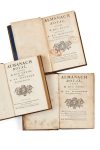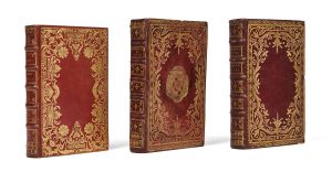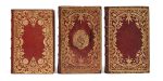 à nerfs orné de caissons dorés avec fleurs de lis dorées répétées, tranches dorées, dentelle intérieure dorée (reliure de l’époque). p 1-7, [11] ff., p. 32-320, p. 313-320 bis, p. 321-636. Almanach royal pour l’année 1779. Notre exemplaire est bien complet du cahier *V ajouté entre les p. 320 et 321. Exemplaire aux armes du cardinal de Rohan, compromis dans l’Affaire du collier de la Reine. JOINTS - Almanach royal, année M.DCC.LXXIII. Paris, Le Breton, [1773]. In-8 (19 x 12,3 cm), maroquin rouge, plaque attribuée à Dubuisson à décor de rinceaux, armes dorées au centre des plats, dos à nerfs orné de caissons dorés avec fleurs de lis dorées répétées, tranches dorées, dentelle intérieure dorée, gardes de papier doré-gaufré (reliure de l’époque). p. 1-5, [13] ff., p. 33-566. Exemplaire en reliure à la plaque attribuée à Dubuisson. - Almanach royal, année M.DCC.LXXXI. Paris, Laurent D’Houry, [1781]. In-8 (19,7 x 11,7 cm), maroquin rouge, plaque attribuée à Dubuisson à décor de rinceaux dorés, roulette dorée encadrant les plats, armes dorées au centre des plats, dos à nerfs orné de caissons dorés avec fleurs de lis dorées répétées, tranches dorées, dentelle intérieure dorée (reliure de l’époque). p. 1-7, [12] ff., p. 33-192, p. 195-669. Exemplaire en reliure à la plaque attribuée à Dubuisson. Provenance : 1. Louis-René, prince de Rohan-Guéméné, cardinal-évêque de Strasbourg (armes). 3. Bibliothèque du Ministère de la Maison de l’Empereur (cachets, n° 500 à la plume). Bibliographie : 1. Galantaris, Manuel, II, p. 284, pl. 10. Manque à OHR (?). 2. Galantaris, Manuel, II, p. 282, pl. 11.3. Galantaris, Manuel, II, p. 284, pl. 10. 1. Restaurations aux coiffes et aux coins, des frottements sur les plats et le dos (avec petit manque de peau en tête du dos), petite mouillure en tête et fin de volume et en pied de la p. 361, petite réfection de papier aux p. 347-348, cahier des p. 373-380 partiellement détaché, petite déchirure en tête des p. 161-162 et 257-258, petit défaut de papier en pied des p. 29-30, rousseurs éparses, note ancienne au premier contreplat. 2. Premier plat insolé, quelques frottements aux coins et au dos, petits manques angulaires aux p. 443-446. 3. Coins frottés avec restaurations maladroites à 2 coins, petits travaux de ver sur une charnière, quelques frottements au dos, p. 193-194 en déficit, les p. 195-196 et 547-548 sont en double, des défauts d’impression aux p. 24