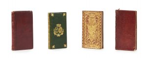 plats, dos lisse orné de motifs dorés (reliure de l’époque). 225 p., 1 f. bl. Calendrier de la cour, « imprimé pour la famille royale et la maison de sa majesté. » Exemplaire aux armes de la duchesse de Berry (1798-1870). JOINTS - Almanach de Bretagne […]. Rennes, Guillaume Vatar, 1759. In-16 (10,8 x 5,7 cm), reliure souple, maroquin havane avec décor à la plaque doré, dos lisse orné de motifs dorés, papier décoré, tranches dorées (reliure de l’époque). [48] ff. Almanach relié dans une élégante reliure du temps. - Almanach royal. Année M.DCC. LXXXVII. Paris, veuve d’Houry, [1787]. In-16 (11,3 x 5,5 cm), maroquin rouge, double filet à froid encadrant les plats, dos lisse orné de filets à froid, doublures et gardes de soie moirée bleu gris, tranches dorées (reliure de l’époque). [77] ff., 1 f. bl., 24 p. - Almanach royal. Année M.DCC. LXXXIV. Paris, veuve d’Houry, [1784]. In-16 (11,3 x 15,8 cm), maroquin rouge, filet à froid encadrant les plats, dos à nerfs, doublures et gardes de soie moirée bleu gris, tranches dorées (reliure de l’époque). [74] ff., 24 p. Provenance : 1. Duchesse de Berry (armes). 2. Ex-libris manuscrit daté du 23 octobre 1822. 4. Paul Adam-Even (ex-libris armorié). Bibliographie : 1. OHR, pl. 2543 (fer non répertorié). 2. Exemplaire partiellement dérelié, petits frottements à la reliure. 3. Coiffe supérieure arasée, coins frottés. 4. Coiffe supérieure arasée, coins frottés.