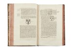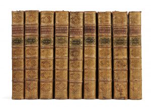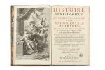 in-folio (39 x 24,5 cm), veau fauve, triple encadrement à froid sur les plats, dos à nerfs ornés de caissons dorés, pièces de titre vieux-rouge, pièces de tomaison noires, dentelle intérieure dorée (reliure de l’époque). [6] ff., 805 p.– [2] ff., 942 p., [1] f.– [7] ff., 920 p., 37 p.– [4] ff., 900 p., 51 p.– [6] ff., 932 p., 47 p.– [2] ff., VI p., 807 p., 56 p.– [2] ff., VI p., 940 p., 72 p.– [2] ff., VI p., 948 p., 70 p.– [2] ff., 484 p., 355 p. Troisième édition, augmentée par les pères Ange de Sainte-Rosalie, Simplicien et Alexis. ILLUSTREE DU FRONTISPICE GRAVE PAR COCHIN D’APRES COYPEL, DE 10 GRANDES VIGNETTES DE TITRE GRAVEES SUR CUIVRE PAR TARDIEU, SIMONNEAU, BASQUOY, THOMASSIN, BEAUMONT ET COCHIN, ET DE TRES NOMBREUX BLASONS GRAVES SUR BOIS DANS LE TEXTE. Dans notre exemplaire, un carton d’un feuillet a été ajouté en tête du t. III au sujet de l’histoire des Montmorency qui vise à préciser la p. 584. « Oeuvre capitale qui a rendu et qui rendra encore d’énormes services » (Saffroy). Provenance : Couvent des Jacobins du faubourg St Germain (cachet ex-libris). Bibliographie : Brunet, I, 303. Saffroy, 10302 b. Reliures passablement frottées, plusieurs coiffes arasées, quelques charnières fragilisées, coins frottés, dos passés, des épidermures et quelques mouillures sur les plats, petites mouillures au début des volumes (et aux derniers ff. du t. V), des cahiers brunis.