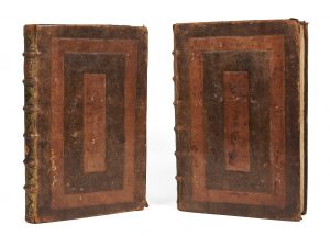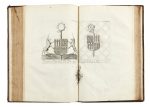 sur les plats décor d’un double encadrement contrastant sur le fond granité bordé de roulettes à froid, dos à nerfs avec motifs dorés, armes dorées au centre d’un caisson de chaque dos, pièces de titre havane, pièces de tomaison brune (reliure de l’époque). [14] ff., 480 p., [8] ff., 32 p., [1] f., 22 p., 6 p.– [1] f., 870 p., [10] ff. Édition originale, seule parue. ILLUSTREE DE 25 PLANCHES HORS-TEXTE, DONT CERTAINES DOUBLES OU DEPLIANTES, DE VIGNETTES ET CULS-DE-LAMPE GRAVES PAR SEBASTIEN LE CLERC, DE LETTRES ET NOMBREUX BLASONS ET SCEAUX. Rare et important ouvrage à la gloire de la maison d’Auvergne. Le tome I contient in-fine la Lettre de Monsieur Baluze pour servir de response à divers escrits… contre quelques anciens titres qui prouvent que Messieurs de Bouillon d’aujourd’huy descendent en ligne directe & masculine des anciens ducs de Guyenne & Comtes d’Auvergne. Paris, Muguet, 1698. Une planche du t. II est collée à la p. 290, conformément à la recommandation du libraire. Les armes dorées aux dos ont été apposées postérieurement en queue par Elize (Elisabeth-Brigitte) Gulston, après grattage des fleurons dorés des caissons concernés. Sa bibliothèque et celle de son mari furent vendues en 1784. Provenance : Elizabeth-Brigitte Gulston (ex-libris armorié et armes poussées aux dos, fin du XVIIIe s.). Bibliographie : Brunet, II, 630. Saffroy, III, 35256. Reliures frottées, coins du t. I arrachés, un mors fendu en tête au t. I, coiffes frottées, portrait-frontispice de Turenne en déficit, mouillure au f. de titre du t. I, salissure à la p. 271 du t. I, petit défaut de papier en pied du feuillet de titre du t. II, p. 133-134 du t. II partiellement déreliées, importante déchirure à la planche dépliante entre les p. 454-455 du t. I, petite déchirure à une planche au t. II, des rousseurs.