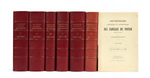 à froid, couvertures conservées (le t. VI est en demi-chagrin rouge) et 1 volume de supplément (t. VII) broché. [4] ff., 798 p.– [2] ff., 792 p.– [2] ff., 799 p.– 798 p., [1] f.– [2] ff., 799 p.– [3] ff., 798 p.– [2] ff., 156 p. Seconde édition, en partie originale, de cet important dictionnaire sur la généalogie des familles poitevines. L’ouvrage est inachevé, interrompu à la lettre M (MON). JOINTE Une lettre dactylographiée volante de Joseph Beauchet-Filleau (avec signatures autographe), remerciant son correspondant M.P. Jacomet pour l’envoi de pièces sur les Macé et s’excusant de ne pas avoir de documents confirmant l’origine mayennaise de la famille Rebuffé. Quelques notes à l’encre au faux-titre du t. III. Ce lot n’a pas été collationné. Provenance : M. Jacomet (facture et lettre). Bibliographie : Saffroy, 32323 et 54961. Quelques brunissures sur les couvertures, infimes rousseurs dans certains volumes, les t . II et IV sont imprimés sur papier vergé, quelques brunissures sur les couvertures et le dos du t. VII.