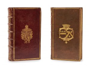 dorées (reliure de l’époque). 9 p., [7] ff., 518 p., ccxiv p. (manque les p. lxix à clxxiv), [1] f. Un tome seul (l’Automne) sur 4 (Verna - Æstiva - Autumnalis - Hiemalis), de cette nouvelle édition du bréviaire selon le rite parisien promulgué par l’archevêque de Paris Charles Gaspard Guillaume de Vintimille du Luc. Cet ouvrage, paru pour la première fois en 1736, fut l’un des plus diffusés parmi les diocèses de France. Exemplaire en maroquin rouge aux armes de la famille lombarde Torelli. JOINT L’Office de la nuit, de laudes, et de prime pour les annuels, les grands et petits solemnels. Paris, Libraires Associés, 1751. In-12 (16,8 x 9,6 cm), maroquin vert olive, triple filet doré en encadrement des plats, armes dorées au centre, dos à nerfs orné de motifs dorés, tranches dorées (reliure de l’époque). [2] ff., 640 p., [2] ff. Texte en latin et en français, en regard sur deux colonnes. Armes non identifiées par OHR. Le premier écu est comparable aux Beauharnais et le deuxième est comparable aux armes des De Thou. Provenance : 1. Famille Torelli (armes). 1. Reliure un peu frottée, coiffe supérieure en partie arasée, nerfs et coins usés, mouillure en marge du f. de titre, mouillure angulaire affectant le bas des p. 135 à 171, quelques rousseurs. 2. Plats légèrement salis, coins et mors frottés, armes peut-être poussées sur des pièces de cuir masquant des armes antérieures, quelques rousseurs.