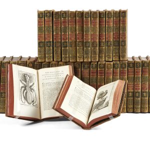 verts ornés de motifs dorés, pièces de titre et de tomaison rouges (reliure de l’époque). Belle collection complète de 127 volumes de la célèbre Histoire naturelle de Buffon, augmentée par C. S. Sonini. Elle se compose des parties suivantes : Théorie de la Terre (4 vol., dont 1 pour les Époques de la nature), Minéraux (12 vol.), Animaux (2 vol.), l’Homme (3 vol.), Quadrupèdes (15 vol., dont 2 pour les Singes), Oiseaux (28 vol.), Reptiles (8 vol.), Mollusques (6 vol.), Crustacés et Insectes (14 vol.), Poissons (13 vol. et 1 vol. pour les Cétacées), Plantes (18 vol.), Tables (3 vol.) L’ENSEMBLE EST ORNE D’UN PORTRAIT DE BUFFON, D’UN PORTRAIT DE SONINI ET DE 1110 FIGURES HORS TEXTE, DONT 8 REPLIEES, LE TOUT GRAVE SUR CUIVRE, et de 17 tableaux imprimés repliés. Rare exemplaire complet des 127 volumes. (Seules les planches ont été collationnées.) Provenance : - F. Belland (doré en pied des dos). - Alphonse Dossat (ex-libris). Bibliographie : Quérard, I, p. 557. Brunet, I, 1377. Reliures frottées avec quelques accrocs, notamment aux coiffes, des coins usés. D’inévitables rousseurs, de rares déchirures aux planches repliées.