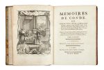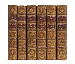 triple filet doré encadrant les plats avec fleurons d’angle dorés, dos à nerfs ornés de motifs dorés avec pièces de titre et de tomaison vieux-rouge, dentelle intérieure dorée (reliure de l’époque). [2] ff., XXIV p.,632 p.– [2] ff., 661 p.– [2] ff., 708 p.– [2] ff., 698 p.– [2] ff., 587 p., XL p.– [2] ff., XL p., IX p.,, 204 p., IV p., 147 p., VIII p., 303 p. Première édition complète de ces importants mémoires pour l’histoire de guerres de religion. ILLUSTREE DU FRONTISPICE GRAVE PAR DUFLOS D’APRES RICHARDSON, DE 17 PORTRAITS HORS TEXTE, DE 5 GRANDES VIGNETTES EN-TETE PAR DUMONT ET BIZOT, DE 2 PLANS DEPLIANTS DE BATAILLES CONDUITES PAR LE DUC DE GUISE ET DE 2 FEUILLETS DEPLIANTS DE « DECLARATIONS DES LETTRES DE CAMP DU ROI ». Cette édition a été préparée par Denis-François Secousse ; le volume de supplément est l’œuvre de Lenglet Dufresnoy. Avant la table des matières du vol. VI, on a relié l’arrêt du conseil d’État ordonnant la suppression de l’ouvrage, en date du 28 avril 1743. 2 p. et 1 f. bl. Provenance : D.D. P.P de Nicolay (ex-libris armorié). Bibliographie : Brunet, II, 215. Des accrocs aux coiffes, plusieurs mors largement fendus en pied, petit manque de cuir en tête du dos du t. IV, des épidermures et quelques taches sur les plats, taches d’encre très prononcées au premier plat du t. IV, quelques rousseurs et petites taches éparses, quelques cahiers brunis,