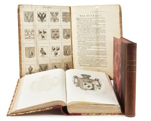avertissement gravés, 286 planches, second titre, 92 planches, 44 p., 16 p. Premier tirage de ce rare armorial, ORNE DE 378 PLANCHES D’ARMOIRIES GRAVEES SUR CUIVRE PAR LEFEVRE. La numérotation des planches saute de 286 à 312, sans manque, les planches intermédiaires n’ayant pas été gravées au moment de la publication. Exemplaire bien complet de toutes les planches. Le second tirage, fait en 1829, ne compte que 274 planches, c’est-à-dire seulement les armes des Pairs vivant à cette date. JOINTS - MEURGEY (Jacques). Armorial de l’Église de France. Mâcon, Protat, 1938. Pet. in-4 (27,7 x 22,1 cm), bradel demi-chagrin acajou, titre doré au dos, tête rouge, couvertures et dos conservés (Pouillet). Envoi autographe signé de l’auteur au docteur Eugène Olivier, célèbre pour sa participation au Manuel de l’amateur de reliures armoriées françaises. - COURCILLON DE DANGEAU (Louis de). Principes du blason. Paris, Jean Moreau, 1709. Pet. in-folio (37,5 x 25 cm), broché, papier marbré. OUVRAGE ORNE DE 14 GRANDES PLANCHES GRAVEES SUR CUIVRE, DONT UNE AQUARELLEE ANCIENNEMENT. Provenance : 1. - Monogramme LL en pied du dos. - G. H. Juignet. 2. Docteur Eugène Olivier (ex-libris et envoi). Bibliographie : 1. Saffroy, 9089. 2. Saffroy, 3101. 3. Saffroy, 2295 1. Reliure un peu frottée. Feuillets de titre et d’avertissement remontés en fond de cahier. Rousseurs, plus importantes en début d’ouvrage. 2. Dos passé. 3. Cartonnage frotté, usagé. Des ff. partiellement déboîtés ou froissés, légères rousseurs.