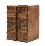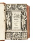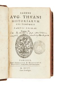 de titre havane (reliure de la 2e moitié du XVIIe siècle). [24] ff., 1004 p., [25] ff.– 1013 p., [20] ff., 1 f. bl. Édition originale de l’Histoire de son temps, parue en même temps qu’une édition in-folio. ILLUSTREE D’UN TITRE FRONTISPICE GRAVE AU PORTRAIT-MEDAILLON D’HENRI IV. Il s’agit des 18 premiers livres de la grande histoire du président De Thou. Celui-ci la prolongera et publiera la suite de 1606 à 1608. Une dernière partie, inachevée, sera publiée après sa mort par Pierre Dupuy en 1620. « Écrite en latin pour le public lettré de l’Europe, c’est l’histoire de celle-ci qu’elle retrace dans sa période de plus grand déchirement » (En Français dans le texte). Provenance : Couvent des Carmes de Bordeaux (ex-libris manuscrit et cachet). Bibliographie : Brunet, V, 840. En français dans le texte, n° 82 (A. Coron). Fortes épidermures, dos frotté, coiffe inférieure arasée et coins très frottés au t. VI, défauts en tête du t. I (manque de cuir et travail de vers), 1 mors fendu en pied aux t. I, II et VI, un feuillet en déficit au 1er cahier du t. I, exemplaire court de marge avec frontispice rogné en gouttière et perte de texte dans l’index du t. II, mouillure affectant les liminaires du t. I, petite déchirure avec perte de texte en marge du 4e f. de l’index du t. I.