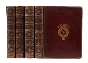 orné de motifs dorés, tranches dorées (Gaudreau relieur de la Reine). I. xiv (sur xvi) p., 622 p.– II. [2] ff., xii, 642 p.– III. [2] ff., iv, 632 p.– IV. vi, 604 p. Les 4 premiers volumes (sur 8) de ce rare ouvrage, resté inachevé (le 8e volume se termine par le mot Police). Reliures aux armes vraisemblablement de Louis-Charles-Auguste Le Tonnelier, baron de Breteuil (1730-1807), premier baron de Touraine, avec la devise « Nec spe nec Metu ». Bibliographie : Brunet, n° 2792. Quérard, II, 503. OHR, pl. 1481, fer du 4e tome très proche du fer n° 6 Les 4 premiers vol. seuls. Coins émoussés et frottés, parfois avec manque de matière, deux coiffes arasées, départs de fentes aux mors du 1er et à un mors des 2e et 4e vol., les autres un peu frottés. Des rousseurs, quelques passages soulignés ou annotés au crayon et à la sanguine. Manque 1 f. liminaire au 1er vol. (frontispice ?), pet. galerie de vers marginale à la fin du 1er vol., en pied du 2e