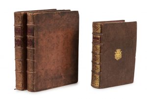 motifs dorés, pièce de titre en maroquin rouge (reliure vers 1700). [4] ff., 947 p. Nouvelle édition corrigée, parue posthumément. ORNEE DE BANDEAUX ET LETTRINES. Important ouvrage historique de la main de Claude Fauchet, un des fondateurs du médiévalisme. L’ouvrage est précédé d’une dédicace au roi Henri IV (8 septembre 1599) qui avait nommé Fauchet historiographe de France. Reliés à la suite : - FAUCHET (Claude). Origines des dignitez et magistrats de France. Genève, Paul Marceau pour la société caldorienne, 1611. 72 p. - FAUCHET (Claude). Origines des chevaliers, armoiries et héraux… Genève, Paul Marceau pour la société caldorienne, 1611. [p. 73-74]- p. 124, [1] f., 1 f. bl. JOINT [BOSQUET]. Dictionnaire raisonné des domaines et droits domaniaux… Paris, veuve Dutillet, 1775. 2 volumes in-4 (26,6 x 19,5 cm), veau marbré, double filet à froid encadrant les plats, dos à nerfs ornés de motifs dorés, pièces de titre et de tomaison en maroquin rouge, XXXVIII p., 558 p.– [1] f., 602 p. Seconde édition. Ouvrage sur le droit des domaines. Texte sur 2 colonnes. Provenance : 1. - Le Gillon, 1691 (ex-libris manuscrit). - Mention d’achat de 1743. - Armes dorées non identifiées (XVIIIe siècle). - Ex-libris manuscrit de 1970. 2. Druneau ( ?) (ex-libris manuscrit). Bibliographie : Brunet, II, 1191-1192. 1. Coins légèrement frottés, un choc en bordure du premier plat, petites épidermures au plat inférieur, large mouillure sur les premiers feuillets, puis petites mouillures marginales affectant une grande partie du volume. 2. Reliures frottées, 2 coiffes arasées, coins émoussés, plat supérieur du t. II très sali, petites brunissures au feuillet de titre du t. I.