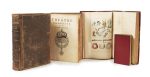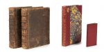 dorés (reliure du XVIIIe siècle ?). [6] ff., 915 p.– [7] ff., p. 919-1882, 1 f. bl., [12] ff. Édition originale de cet important ouvrage sur les ordres militaires. ILLUSTREE DE 2 GRANDES VIGNETTES DE TITRE GRAVEES EN TAILLE-DOUCE PAR GAULTIER, D’UNE GRANDE VIGNETTE D’ARMES GRAVEE (T. I) ET D’UNE FIGURE D’ARMES A PLEINE PAGE ET DE NOMBREUX BANDEAUX, CULS-DE-LAMPE ET LETTRINES. JOINTS - PROST (Bernard). Traicté de la forme et devis comme on faict les tournois par Olivier de la Marche, Hardouin de la Jaille, Anthoine de la Sale […]. Paris, A. Barraud. 1878. In-8 (24,7 x 15,7 cm), demi-maroquin rouge à coins, double filet à froid bordant les plats et les coins, armes dorées en tête du premier plat, dos lisse orné d’un semis de fleurs de lis dorées, couvertures conservées (reliure de l’époque). [1] f., XIX p., 259 p., [2] ff. ILLUSTRE DE 16 PLANCHES GRAVEES DONT LE FRONTISPICE. Tirage limité à 260 exemplaires numérotés, celui-ci un des 258 sur papier vergé fort (n° 36), avec les planches finement aquarellées. - CLAVERET (Jean), L’Écuyer ou les faux nobles mis au billon, Paris, 1665. In-12 (14 x 7,5 cm), reliure janséniste, maroquin rouge, dos à nerfs, tranches dorées, dentelle intérieure dorée (Thibaron). 1 f. bl., [6] ff., 103 p. Copie contemporaine de l’édition originale. Comédie du temps, dédiée « aux vrais nobles de France ». Provenance : 1. -Monogramme HMDB (tampon ex-libris). - Librairie Georges Saffroy (étiquette). 2. Félix Philibert comte de Simony (armes et ex-libris armorié). Bibliographie : 1. Saffroy, 3693. 3. Brunet, II, 91 1. Reliure très endommagée, coiffes arasées, charnières très fragilisées, des cahiers brunis. 2. Petits frottements au dos et aux coins, un coin gauchi, quelques rousseurs, couvertures légèrement salies. 3. Dos et tête des plats passés, coiffe supérieure arasée, petits frottements aux charnières, exemplaire lavé.