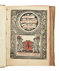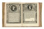 (signatures : A-Z4, AA-HH4). Seconde édition de cet important recueil de monnaies antiques. ILLUSTREE DE 201 PORTRAITS EN MEDAILLON GRAVES SUR BOIS. Presque chaque page se trouve pourvue d’un encadrement avec les portraits en médaillon et un commentaire. Les portraits représentent principalement des personnages illustres de l’histoire romaine, byzantine et germanique et sont accompagnés de notices bibliographiques. Cette édition s’appuie sur l’originale publiée à Rome en 1517. L’ouvrage est fondé sur le riche médaillier de Jacopo Mazzocchi. Bibliographie : Brunet, II, 1423. USTC, 71133. Les ff. 17 et 20 sont en déficit, feuillet de titre légèrement dérelié avec petit travail de vers, les 15 derniers ff. sont accidentés en marge extérieure suite à une mouillure, petites bandes de papier ajoutées en marge pour consolider les ff. 114 et 115, petites déchirures marginales au dernier f. avec petite perte de texte.