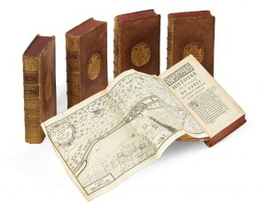 dorées au centre des plats, dos à nerfs ornés, avec pièces de titre vieux-rouge et pièces de tomaison caramel, dentelle intérieure dorée (reliure de l’époque). [3] ff., 576 p.– [2] ff., 498 p., [2] ff.– [2] ff., 586 p.– [2] ff., 532 p.– [1] f., XX p., 544 p. Édition originale. ILLUSTREE DE 4 PLANS DEPLIANTS DE LA VILLE DE PARIS. Importante histoire de Paris des débuts de la monarchie jusqu’au règne de Louis XV. Exemplaire aux armes de Louis-Hilaire Du Bouchet, comte de Sourches. Provenance : - Du Bouchet, comte de Sourches (armes). - Bibliothèque du château d’Abondant (cachet ex-libris). Bibliographie : OHR, pl. 580. Des frottements aux coins, plats et dos, 3 coiffes supérieures arasées et 2 mors fendus, dos insolés, quelques rousseurs éparses.