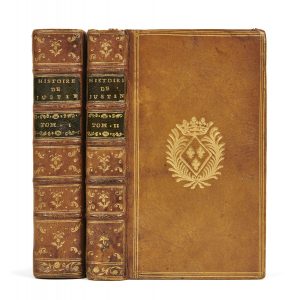 dorées au centre, dos à nerfs ornés de motifs dorés, pièce de titre et de tomaison de maroquin vert foncé, dentelle intérieure dorée, tranches dorées (reliure de l’époque). I. [3] ff. (manque le f. aii), 474 p., [11] ff.– II. [1] f., 357 p., [10] ff. Rance-Bourrey indique que le tome I débute par 28 p. non chiffrées. Ces pages manquent à notre exemplaire. Il est cependant bien complet de l’extrait du privilège, qui est accordé à Horace Molin, pour 8 ans, le 21 février 1692. Exemplaire en maroquin citron aux armes de Madame Sophie, l’une des filles de Louis XV. « Les volumes ayant appartenu à Mesdames de France, filles de Louis XV et de Marie Leczinska, ne se distinguent par la couleur du maroquin sur lequel sont frappées leurs armes. Madame Adélaïde faisait revêtir les siens en maroquin rouge, Madame Victoire, en vert, et Madame Sophie, en citron. Ces ouvrages, qui étaient reliés par Fournier, à Versailles, et par Vente, concernaient pour la plupart la religion, la littérature, l’histoire et les voyages » (OHR). Provenance : - Madame Sophie (armes). Bibliographie : Rance-Bourrey, L’Académie d’Arles au XVIIe s., vol. 3, p. XXXVII, n° 7. OHR, pl. 2514, fer n° 4. Reliures frottées et légèrement salies, coins émoussés, coiffe supérieure du t. 2 arasée, au t. 1 : plusieurs petites annotations à l’encre marginales, petit manque angulaire au bas de la p. 385 sans atteinte au texte, au premier tome, manque le f. aii, ainsi que 28 p. non chiffrées, au t. 2 : feuillets brunis, nombreuses rousseurs.