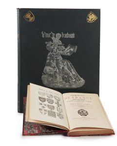 plat, dos lisse orné. XXVI p., 292 p., [1] f. OUVRAGE ILLUSTRE DE 116 CHROMOLITHOGRAPHIES COMPRENANT 942 ECUS ET 74 FIGURES EQUESTRES. Tirage limité à 500 exemplaires, celui-ci un des 400 sur papier vélin teinté (n° 183). Ouvrage publié d’après le manuscrit 4790 du manuscrit de la Bibliothèque de l’Arsenal, comprenant les figures équestres des chevaliers de la Toison d’or puis celles des souverains et princes de l’Europe au XVe siècle. JOINT VALLET DE VIRIVILLE (Auguste). Armorial de France, Angleterre, Écosse, Allemagne, Italie et autres puissances. Paris, Librairie Bachelin-Deflorenne, 1866. In-8 (24 x 15,4 cm), demi-chagrin rouge, plats et dos bordés d’un double filet à froid, dos à nerfs orné (Bourlier). [1] f., XII p., 232 p. ARMORIAL ILLUSTRE D’UNE PLANCHE LITHOGRAPHIEE DE BLASONS EN FRONTISPICE. Provenance : 2. Docteur Mauricet (tampon ex-libris). Bibliographie : Saffroy, I, 2899 et 2894. 1. Petits frottements à la reliure, coiffes gauchies, marges brunies, petits manques de cuir en pied du dos, bandes de renfort en tête et fin de volume, petites taches au feuillet de titre. 2. Dos passé, coins et dos frottés, une étiquette grattée et partiellement retirée sur la première garde, quelques rousseurs en fin de volume.
