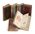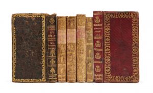 des plats, dos lisse orné de motifs dorés (reliure de l’époque). 191 p. Exemplaire bien complet du premier feuillet d’avis, qui manque souvent. - Annuaire ou Calendrier du département de Lot et Garonne, pour l’année bissextile 1816. Agen, Noubel. In-16 (11,8 x 6 cm), demi-basane blonde à coins, dos lisse orné de motifs dorés (reliure de l’époque). 202 p. (manque le premier f. liminaire). - Annuaire ou Calendrier du département de Lot et Garonne, pour l’année 1817. Agen, Noubel. In-16 (11,9 x 6 cm), demi-basane blonde à coins, dos lisse orné de motifs dorés (reliure de l’époque). 202 p. (manque le premier f. liminaire). - Annuaire ou Calendrier du département de Lot et Garonne, pour l’année 1818. Agen, Noubel. In-16 (12,2 x 6,3 cm), demi-basane blonde à coins, dos lisse orné de motifs dorés (reliure de l’époque). 190 p. (manque le premier f. liminaire). - Annuaire ou Calendrier du département de Lot et Garonne, pour l’année bissextile 1820. Agen, Noubel. In-16 (11,7 x 6 cm), demi-basane blonde à coins, dos lisse orné de motifs dorés (reliure de l’époque). 191 p. (manque le premier f. liminaire). - Annuaire ou calendrier du département de Lot et Garonne pour l’année bissextile 1824. Agen, Noubel. In-16 (12,5 x 6,2 cm), maroquin à long grain rouge, large dentelle dorée en encadrement des plats, dos lisse orné de motifs dorés, tranches dorées (reliure de l’époque). 191 p. Exemplaire bien complet du premier feuillet d’avis, qui manque souvent. Ensemble de 6 annuaires du département du Lot et Garonne, dont 5 proviennent de la bibliothèque d’Olivier Le Bas. Provenance : 1. 2. 3. 4. 5. Olivier Le Bas (ex-libris armorié). 1. Reliure usée, petites épidermures, mors fendus, coiffe supérieure à moitié arasée, coins frottés, l’un très usé. 2. 3. 4. 5. Reliures frottées, éclats aux coiffes, quelques départs de fentes aux mors, rousseurs éparses. 5. Dernier feuillet collé au contreplat. 6. Reliure légèrement salie, coins et mors frottés, légères rousseurs, infime déchirure marginale à un f.