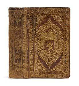 encadrées d’une roulette et de fleurons avec feuillage doré aux angles, traces d’attaches, dos lisse orné d’une bordure et de feuillages dorés avec encadrement d’un triple filet doré, tranches dorées (reliure de l’époque). [40] ff., 718 p., 1 f. bl. Nouvelle édition de l’Histoire générale des Indes. Importante histoire écrite à Lisbonne par le jésuite Maffei à partir d’une volumineuse documentation sur les missions au Brésil, aux Indes, en Chine et au Japon. Cette édition a été partagée entre les libraires Adam Cavelier et Jacques Mangeant. Belle reliure décorée aux armes d’Henri de Schomberg, comte de Nanteuil, avant qu’il obtienne le bâton de maréchal de France. Provenance : Henri de Schomberg, comte de Nanteuil (armes). Bibliographie : Brunet, III, 1290. OHR, pl. 1807 (variante sans le bâton de maréchal). Reliure frottée, dos passé avec petits travaux de ver, coins émoussés et un coin arraché au plat inférieur, importantes mouillures tout au long du volume, quelques rousseurs.