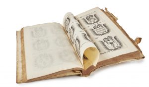 PAR CLAUDE MAGNENEY : TITRE-FRONTISPICE, [2] FF. D’EPITRE DEDICATOIRE ET 212 FF. (CHIFFRES 209) D’ARMOIRIES. « Cet ouvrage entièrement gravé est très rare aujourd’hui » (Guigard). Les bibliographies spécialisées mentionnent, pour cette édition de 1633, deux tirages de 209 planches numérotées ou non. Par ailleurs, on connaît plusieurs séries de planches jusqu’en 1663, date de la nouvelle édition, ce qui explique les variations de collation d’un exemplaire à l’autre. Les planches sont ici numérotées, avec 3 planches en bis (106 à 108). Quatre blasons ont été aquarellés anciennement. Enrichi d’une table manuscrite volante de 13 p. Rare exemplaire, un des plus complets, de ce beau recueil d’armoiries. Provenance : Philippe Gay (ex-libris manuscrit répété). Bibliographie : Saffroy, I, n° 2973 (indique des planches non numérotées). Guigard, 3242. Reliure très usagée, le second plat et le dos lacunaires. Très légères rousseurs, de rares petites déchirures sans gravité. F. de titre légèrement effrangé, 1er f. d’épître un peu court en gouttière, coin supérieur des tout premiers ff. un peu usagé.