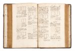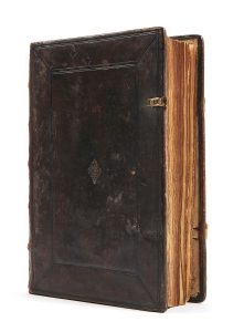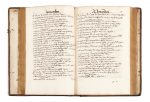 nerfs, pièce de titre « Ancien Armorial MSS », double encadrement sur les plats de filets à froid, un fermoir en laiton. XX ff., 212 ff. (dont les ff. 205-212 sont blancs), suivis de [8] ff. blancs et justifiés, précédés de 2 ff. de gardes de papier et suivis de 3 ff. de gardes de papier sur lesquels on a contrecollé une table des matières tapuscrite, écriture cursive à l’encre noire, texte sur une et deux colonnes, frontispice à l’encre et au lavis, mention « Ancien armorial », découpe au titre-frontispice avec des répercussions sur le dessin d’armoiries au verso, armoiries et écus tracés à l’encre, certains in-texte, d’autre dessinés sur du papier rapporté et contrecollés (cf. f. 125 v) ; table dactylographiée collée en fin de manuscrit. En français, manuscrit sur papier, avec armoiries tracées à l’encre. Copie amplifiée et modifiée de l’Armorial dit « d’Urfé », composé vers 1380 par le héraut Lefebvre dit Walsain, en vieil langage picard. Cet armorial fut trouvé à la prise de Calais et est demeuré es mains de M. d’Urfé, gouverneur du Dauphin, depuis Roi de France François II. On conserve une dizaine de témoins manuscrits, copie d’un original perdu. Il a servi de canevas à de nombreux autres armoriaux qui reprirent en les amplifiant le contenu de leur modèle. Il a été suggéré que la présente copie est redevable à « Bara », peut-être Hiérosme Bara, orfèvre et héraldiste de la fin du XVIe siècle. L’adresse « Au lecteur » aux ff. XVIII-XIX n’est malheureusement pas signé et débute : « Dieu par sa tresgrande bonté a voulu que me soit tombé entre mes mains (apres la mort du possesseur) un ancien livre des blasons des armoiries… » (p. XVIII). JOINT Une L.A.S., signée « C. Mimet », datée 10 juillet 1936, sans doute adressée à Henry Chandon de Briailles indiquant que cet armorial « est celui qui figure à la Bibliothèque nationale sous la cote 32753. Les blasons de Bourgogne se trouvent dans ce ms. aux folios 56 et suivants […] ». Un examen de l’Armorial dit d’Urfé cité dans cette lettre (Paris, BnF, fr. 32753) permet bien de remarquer que les textes trouvés aux ff. 56v-61 correspondent bien au texte du présent manuscrit ff. 42v-44. La suite des textes confirme cette même origine. Provenance : - Manuscrit copié en France, sans doute dans le dernier quart du XVIe siècle. La lettre jointe (tardive, datée du 10 juillet 1936) attribue la copie du manuscrit à « Bara ». - Hudson Gurney ((1775-1864). - Chandon de Briailles, célèbre famille de producteurs de Champagne. Le manuscrit porte deux vignettes ex-libris de la famille, les deux relatifs à Henri comte Chandon de Briailles (1898-1937). - Paul Adam-Even (1902-1964). Provenance complète sur demande. Plat inférieure détaché, mors supérieur fendu, restaurations, épidermures, manque un fermoir.